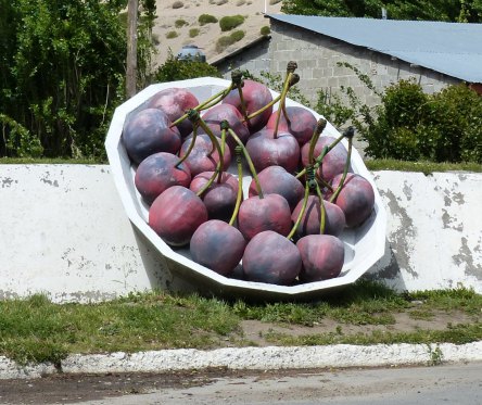 Enfin nous nous dirigeons vers le grand lac qui se nomme lac Buenos Aires en Argentine et General Carrera au Chili. La première vue est magnifique, eau outremer ourlée de vagues blanches avec en arrière plan des montagnes enneigées. Et oui, encore une fois le vent souffle très fort ! Nous traversons Los Antiguos, ville réputée pour ses cerises (elle en fait sa devise) ; nous cherchons les cerisiers et en découvrons quelques uns, bien à l’abri derrière de grandes haies de peupliers. Malheureusement, les fruits sont encore verts. Pas de regret, nous n’aurions pas pu en acheter car nous nous dirigeons vers la frontière chilienne et les produits frais n’ont pas le droit de transiter. 12h30, nous sortons d’Argentine, 13h nous entrons au Chili, la fouille n’a pas été très longue.
