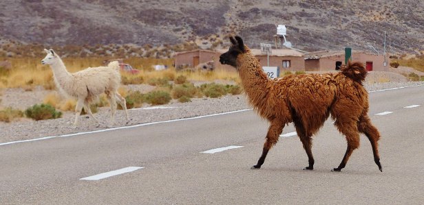 Puis c’est la descente (un peu, 3700m d’altitude) sur les Salinas Grandes, vaste étendue blanche coupée d’une ligne droite : la route. Les salines sont encore en activité, des tas de sel ponctuent l’horizon. Ensuite viennent les hauts plateaux avec leurs herbes jaunies et des troupeaux de lamas. Ceux-ci sont drôles, avec leur laine qui leur fait des pantalons bouffants !