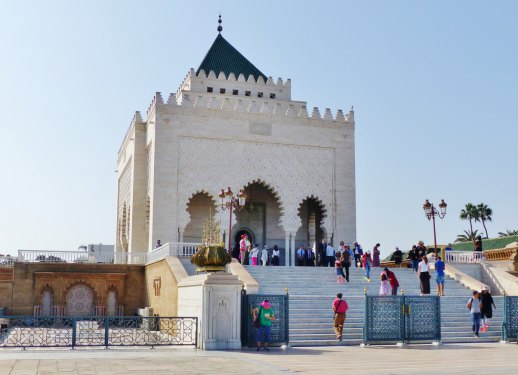 Il est tôt, tout ce quartier dort encore, parcouru seulement par des touristes (majoritairement en troupeaux). Dans le jardin, tout est calme, parfumé, les jardiniers s’affairent au nettoyage des parterres. De la terrasse du café des maures, on admire les murailles, le fleuve et la ville de Salé. Ensuite, on rejoint la tour Hassan et le mausolée de Mohammed V. Ces deux monuments, juchés sur une esplanade, forment un ensemble harmonieux. Le minaret inachevé (la tour Hassan) et les colonnes tronquées donnent une impression de grandeur, ce sont les vestiges d’une mosquée commencée vers 1196, et jamais terminée. Tout à côté se trouve le mausolée où sont inhumés les 3 derniers rois du Maroc. Le lieu finement sculpté, richement décoré, est gardé par de nombreux gardes du roi : il y a ceux à cheval, ceux vêtus de blanc portant des fusils d’apparat et ceux vêtus de vert. Etonnamment, tous se laissent prendre en photo.