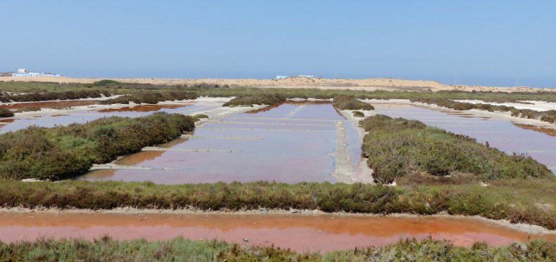 Après El Jadida, nous suivons la côte par une petite route qui chemine entre la zone côtière occupée par du maraichage (champs de tomates, de melons, herbes…) et les landes sèches. Les villages sont implantés plutôt du côté sec (il est vrai que l’humidité dégagée par l’océan est pénible). Nous croisons de nombreuses personnes, juchées sur des ânes chargés de 2 paniers. Comme dans de nombreux pays, on trouve au bord de la route les produits cultivés localement : hier du raisin, aujourd’hui des courges de toutes tailles et de toutes formes. A Oualidia, nous nous posons le temps du repas sur la plage, près d’une magnifique lagune.