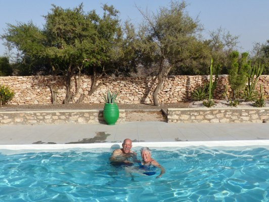 En début d’après-midi, nous arrivons chez nos amis, qui ont fait construire une magnifique villa au Sud d’Essaouira. Ils ont eu beaucoup de soucis, les péripéties ont été nombreuses, mais le résultat en valait la chandelle. Après-midi détente dans la piscine et repas sous les étoiles.