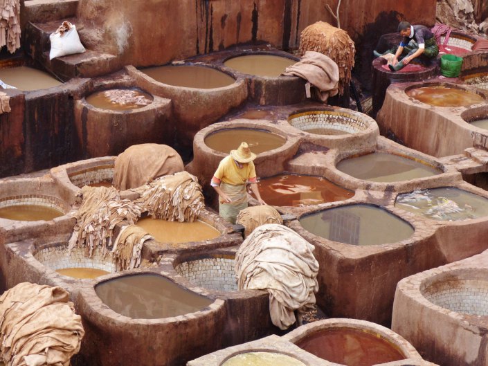 Nous changeons de quartier, montons sur la colline pour voir, de la mosquée en plein-air, l’ensemble de la Médina. Ensuite, nous entrons dans cette vieille ville. D’abord, direction les tanneurs. D’une terrasse on peut voir les différentes étapes du tannage ; ici les peaux sont traitées par des processus naturels (chaux, fiente de pigeon, colorants végétaux), à la main. Le travail nous semble éprouvant (odeur, macération…).