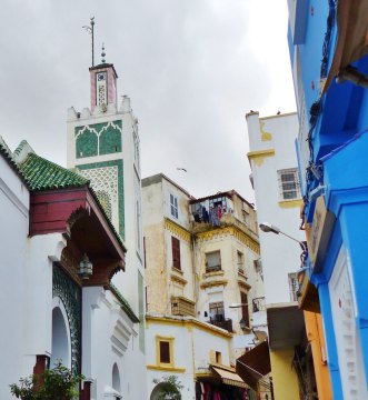Aujourd’hui, toujours plus au Nord, on part à la découverte de Tanger et sa Médina. Nous n’irons pas jusqu’à la grotte d’Hercule, le temps ne s’y prête pas, mais par contre, nous flânerons plusieurs heures dans la vieille ville. Nous y verrons des ruelles étroites et en pente, de belles bâtisses, des quartiers peints en bleu, des mosquées richement décorées, des palaces délabrés. Du sommet de la kashba, nous dominons le port de pêche (il nous semble que tous les bateaux sont là, le temps est-il encore trop mauvais ?), et surtout, nous apercevons les côtes espagnoles qui nous semblent vraiment proches.