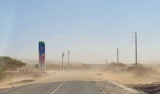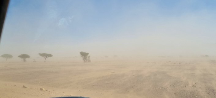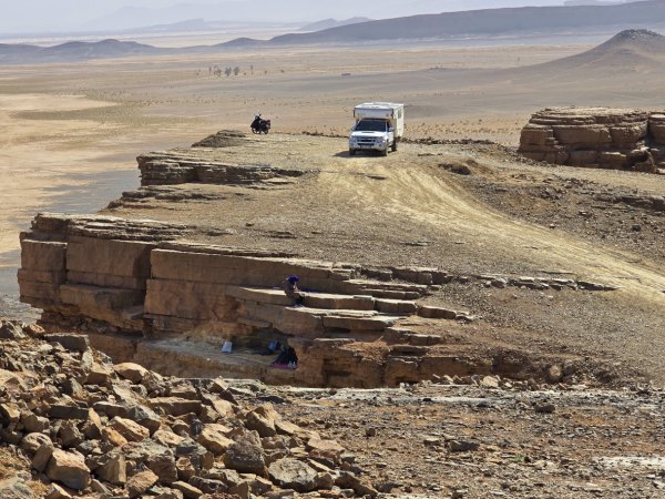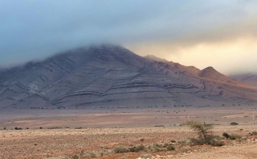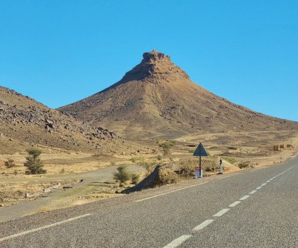 Partis au lever du jour (8h30), nous roulons sous un ciel très bas jusqu'à Assa. On devine le relief qui a des formes surprenantes.