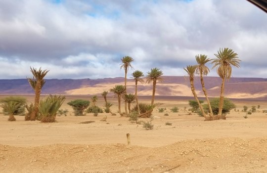Le trajet Foum Zguid-Zagora nous fait suivre une large vallée aux étendues ni désertiques ni cultivées : un entre 2. Mais lorsqu'on approche de Zagora de grandes propriétés agricoles apparaissent : clôtures, plantations de palmiers, cultures sous tunnel, pompes alimentées par des panneaux solaires et grandes réserves d'eau.