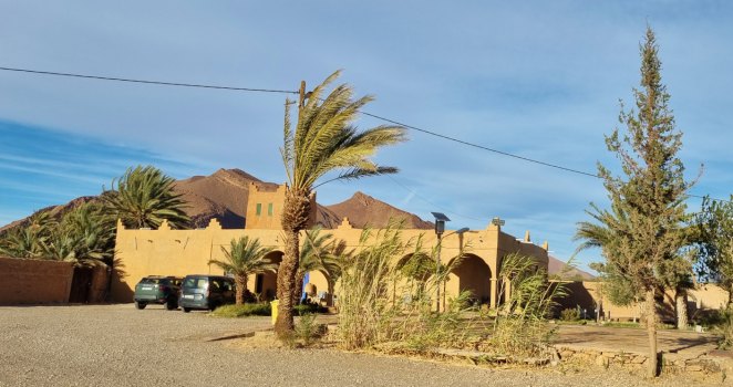 C'est avec joie que nous arrivons à Foum Zguid, le vent de sable reste plus au sud et là on peut profiter du soleil. On passe la nuit au camping Kaima, où l'orthographe est approximative.