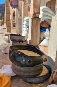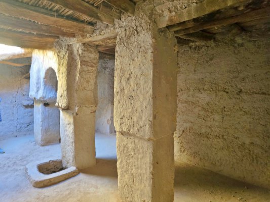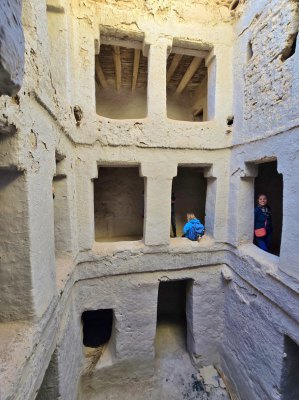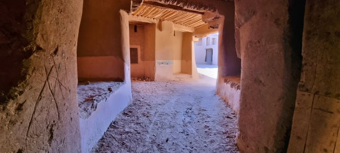 Le vieux village qui tombe en ruine était construit pour que les habitants se protègent de la chaleur (ici en été, il peut faire 50° pendant 4 mois). Nous parcourons les sombres couloirs et arrivons devant la maison du grand père du guide. C'est une des mieux conservées. C'est une construction carrée sur 4 niveaux, avec au centre un petit patio qui fait puits de lumière, c'était un lieu de vie. Ensuite 2 étages car le grand père avait 2 femmes. Et un toit terrasse où on trouve la cuisine.