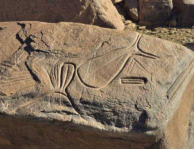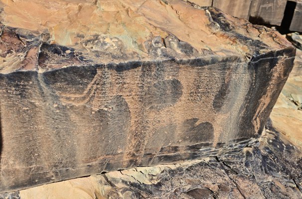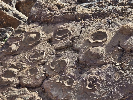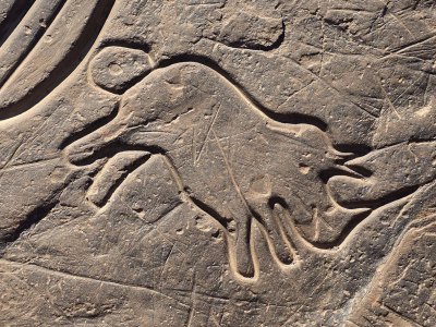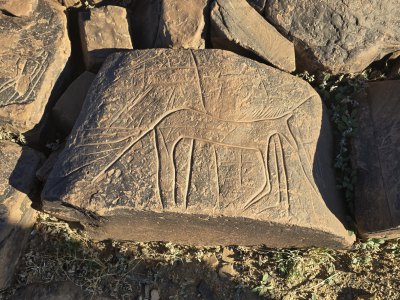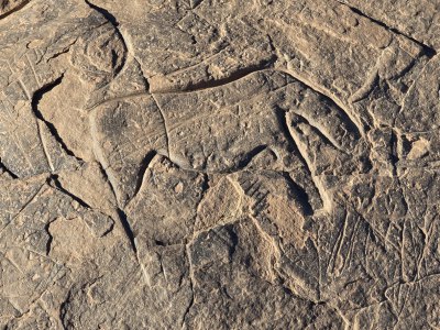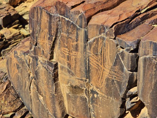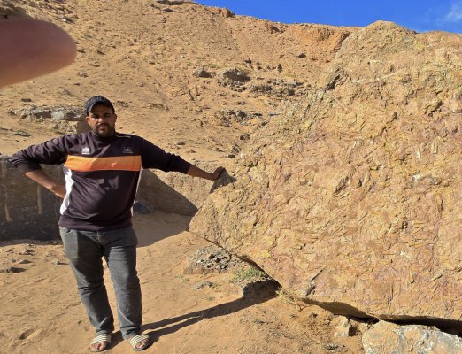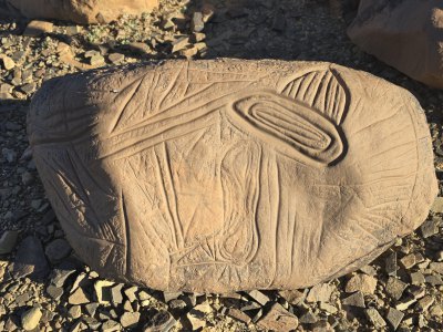 Ce matin, direction les gravures rupestres de Ait Ouazzik (30.68414° N, 5.64519° W). Après quelques kilomètres de route, on prend une piste. On suit un canyon au débouché duquel s'ouvre une vaste vallée. De-ci, de-là, des plantations de pastèque. Le site est sur une crête. Là, accompagnés par le gardien, Ahmad, nous découvrons des centaines de gravures au trait. Certaines sont mystérieuses. Le guide est précieux car les plus belles ne sont pas celles mises en évidence.