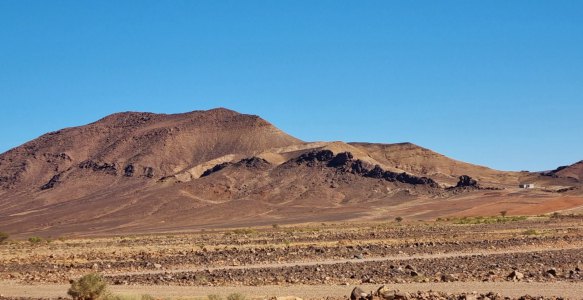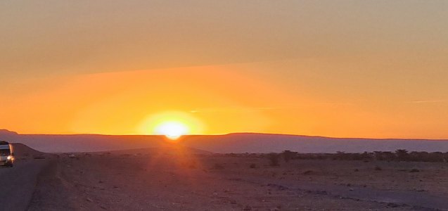 Ce matin départ à l'aube, ce qui nous permet de voir un magnifique lever de soleil. Puis toute la journée nous alternerons paysages magnifiques et vent de sable qui cache tout. A Tata on trouve un drôle de boulanger: son pain est ressemble à une pâte à pizza et surtout il le fait cuire sur un lit de gravier. Encore une fois, nous ne trouvons pas de viande, il ne reste dans les boucheries que des os et du gras un peu défraîchi.
