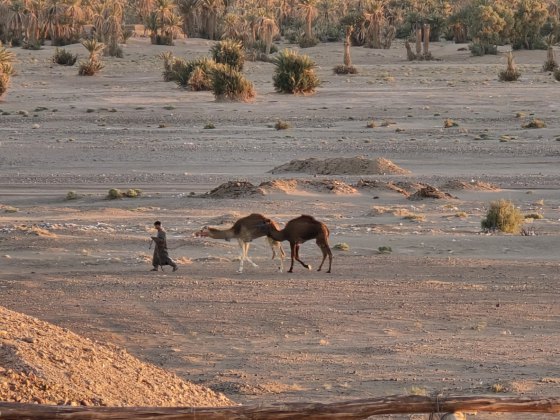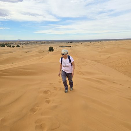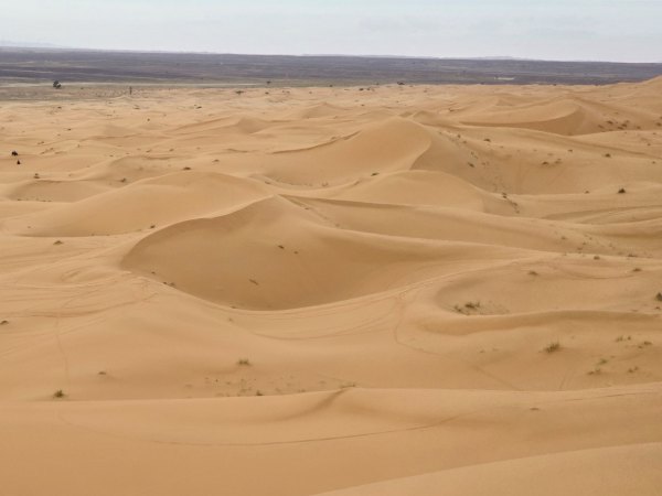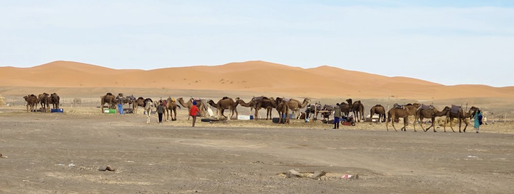 En milieu d'après-midi, nous arrivons près de Merzouga et allons au camping rustique "Océan des Dunes" (rustique car installations qui datent, mais tout est propre et l'eau chaude) où nous sommes très bien accueillis. On aime bien, il est situé à 2 pas de l'erg Chebi. En face du camping, les dromadaires attendent les touristes en mangeant ; une ligne de ketara s'étire (système d'irrigation traditionnel souterrain utilisé pour capter l'eau au pied de la dune). On n'a plus qu'à s'élancer à l'assaut de la plus grande dune. Comme le soleil est voilé, on ne transpire pas trop. Défi réussi ! Au retour une douche est bienvenue : on est un peu ensablés !