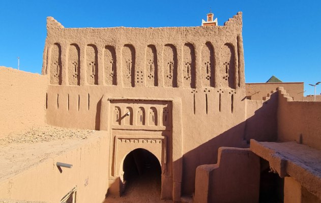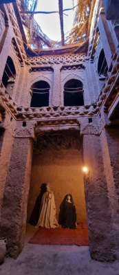 Nuit très calme et étoilée au camping La Boussole de Mhamid. Ce matin, direction le souk. Bon, et bien les Berbères ne sont pas très matinaux! Et c'est un tout petit souk où on trouve essentiellement les fruits et légumes de saison. Le tour est vite fait. Plus loin, on s'arrête à Ouled Driss pour visiter le musée maison traditionnelle. La première impression est excellente, la kashba est en bon état, peu de maisons tombent en poussière. Comme à Icht, on circule dans des ruelles couvertes, éclairées par des puits de lumière. On trouve la Maison Traditionnelle. C est une belle bâtisse, murs travaillés, plusieurs étages et objets du passé racontant la vie dans ces campagnes.