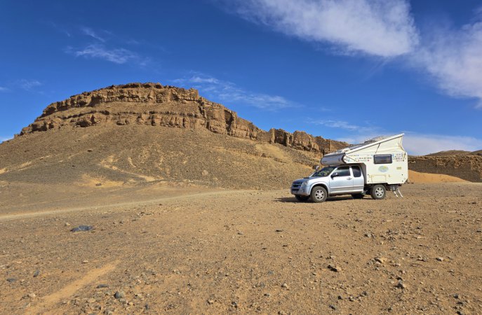 Hier au soir, ce qui était prévisible est arrivé, nous ne sommes pas très loin de l'Algérie et les autorités veillent sur notre sécutité. Donc nous etions merveilleusement bien installés lorsqu'à 19h, un local est venu nous trouver. Il dit être le chef du village et veut nous envoyer à l'auberge de celui-ci. Ah, non, on ne bouge pas. Il repart. A la nuit, (20h) une voiture éclairée comme un sapin de Noël arrive. Ce sont les forces auxiliaires que le chef a fait venir. Ça parlemente mais nous n'aurons pas gain de cause. Il nous faut bouger pour notre sécurité et comme on ne veut pas aller à l'auberge, on accompagne les "militaires " jusqu'à leur base. Bon, on est moins bien installé, pas de ciel étoilé et surtout des rafales de vent qui nous secouent en tous sens.