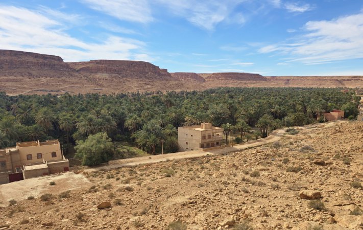 Ensuite, direction Erfoud en longeant l'erg Chebi toujours aussi surprenant : un reg tout noir d'où jaillissent des dunes orangées. Après Erfoud, on retrouve des roches et on s'engage dans la vallée du Ziz , de plus en plus encaissée au fond tapissé de palmeraies.