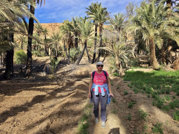Vers 15h nous arrivons au camping Tissirt à Ouled Chaker qui est implanté dans la palmeraie. De là, on peut aller faire un tour à pied au milieu des palmiers au tronc noirci par un incendie il y a quelques années.